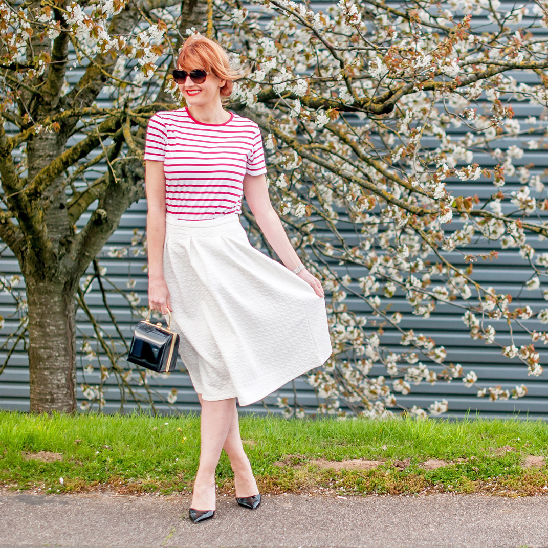 I bared my legs for the first time this year on Saturday! I probably blinded a few folk, they are eternally white but still, it was so freeing not to have to wear tights! Hasn't the weather been absolutely gorgeous? And the blossom in your photos is the perfect background to your sweet and simple outfit. Stripes and a skirt – perfect for Spring.