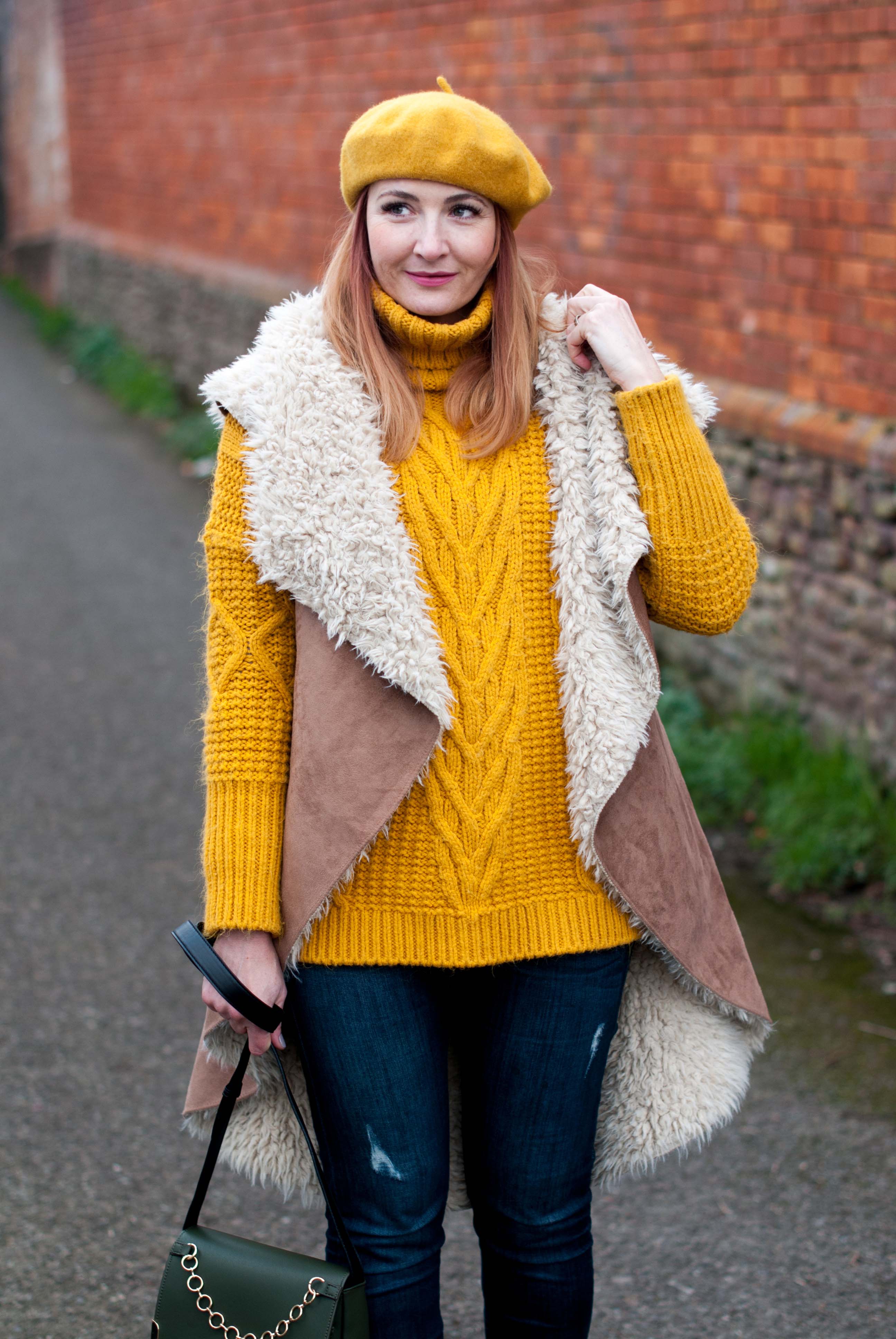Just about everything you see here has been worn before. I have a huge collection of winter coats – when you’re a colour lover you want one in every colour imaginable, so that’s a lot of coats. Each winter I try and work my way through them all, making sure each one gets some love and fresh air at some point. I know it’s not strictly a coat, but the faux fur shearling gilet hasn’t seen the light of day OUTSIDE for a while (sometimes I wear it indoors as a quick, snuggly throw-on to keep my bod warm). I last wore it on the blog just over two years ago (hence my want to feature it again!) and that time I styled it with a cream roll neck sweater and a vintage hat.