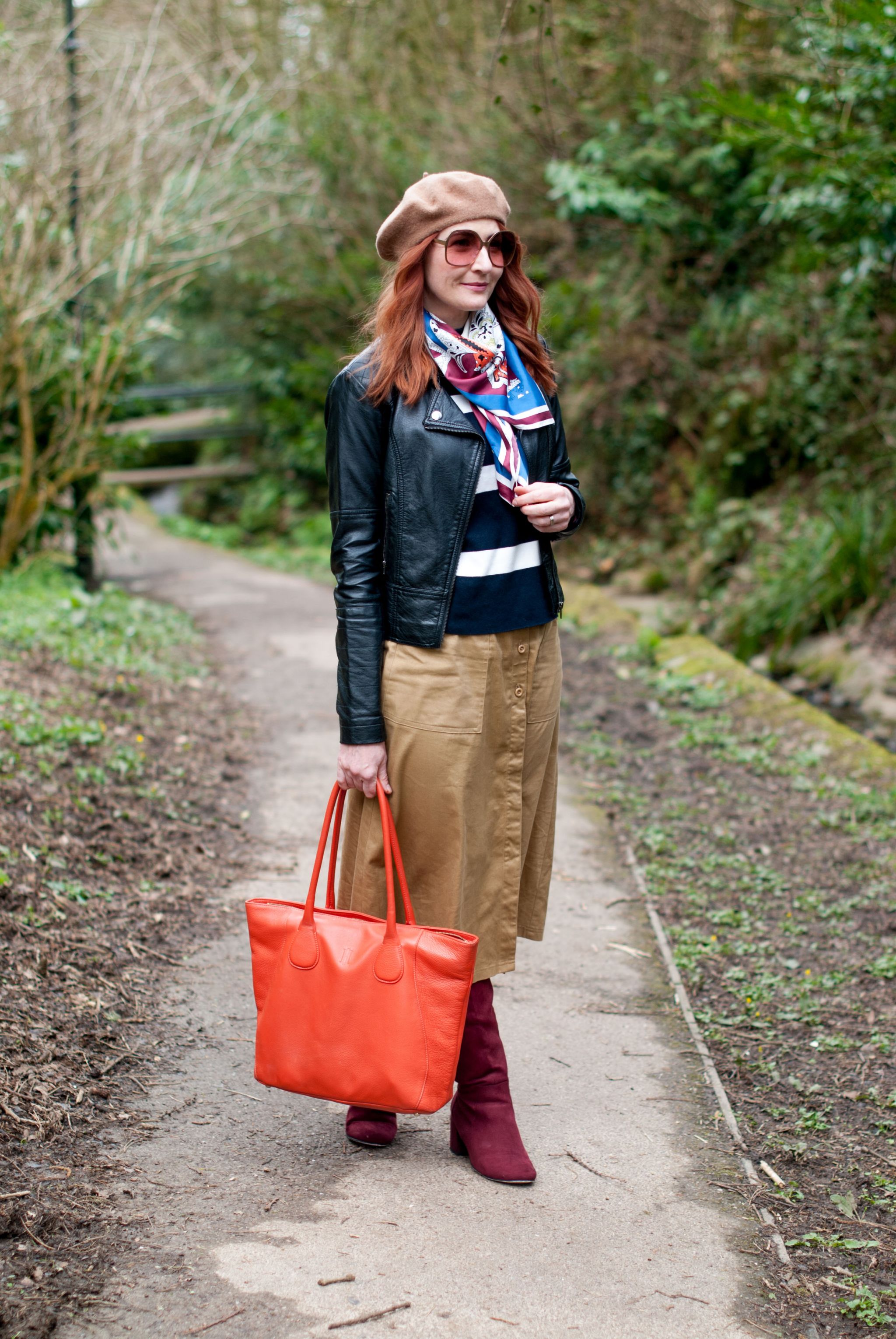 I called this post “the power of accessories” because that’s exactly how I felt after having another go with this outfit later the same week. Whilst the original outfit worked to some extent, it just didn’t WORK, if you see what I mean. The proportions were right, combining a short biker jacket with a midi skirt, then adding knee high boots so the tops aren’t seen under the hemline, but all in all it was just a bit “meh”.