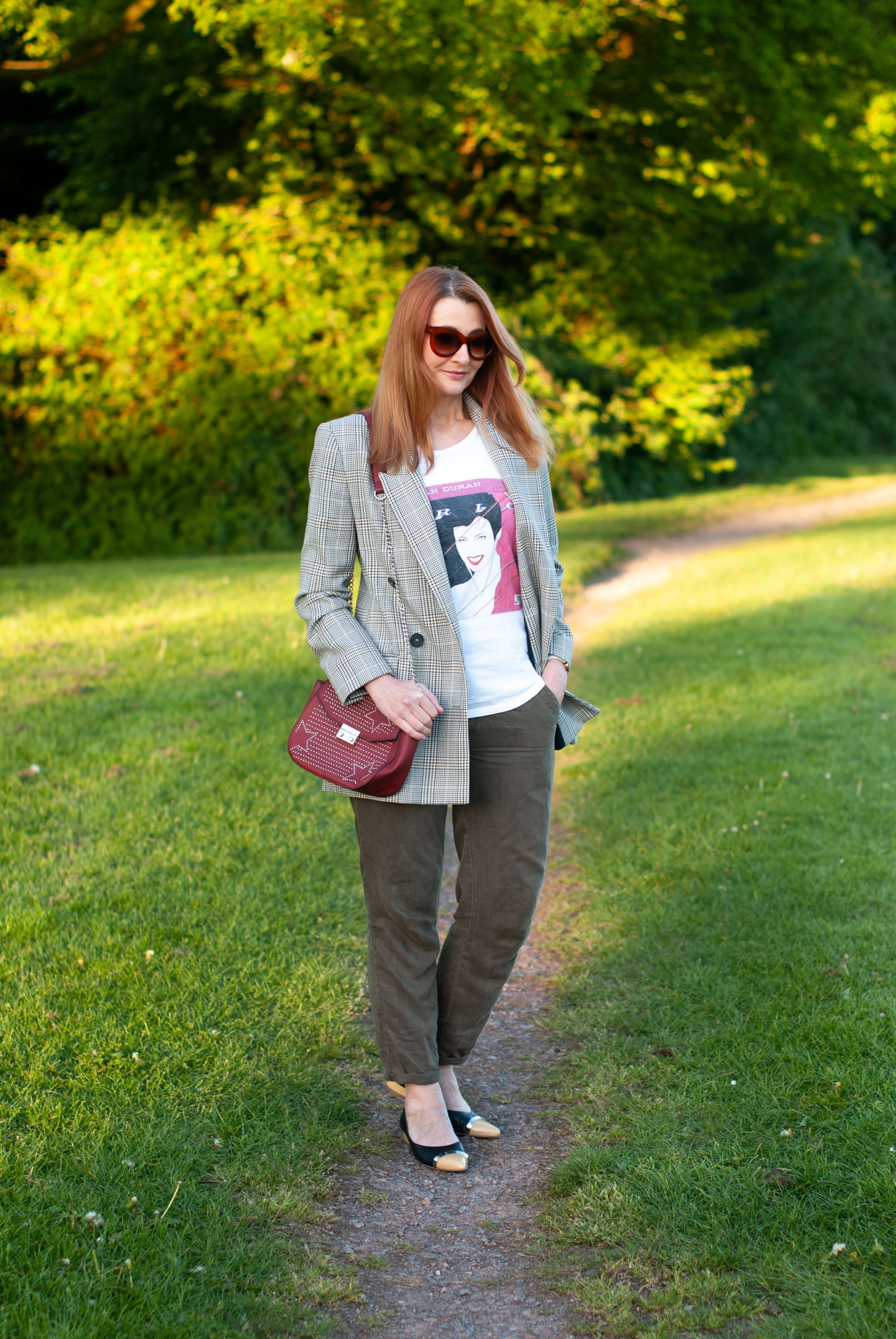 – it only took two items to take it up that one level smarter than its initial “slobbing around the house” vibe. This was a weekend outfit comprising of simply a band t-shirt (more on that in a minute) and baggy chinos. Nothing exciting, but to step out the house for something other than dog walking I needed to make it at least a LITTLE smarter – smart casual, in other words. So all I added was the Prince of Wales check blazer (last seen here) and the pointed two-tone flats which I’ve had forever, and voilà – smart casual.