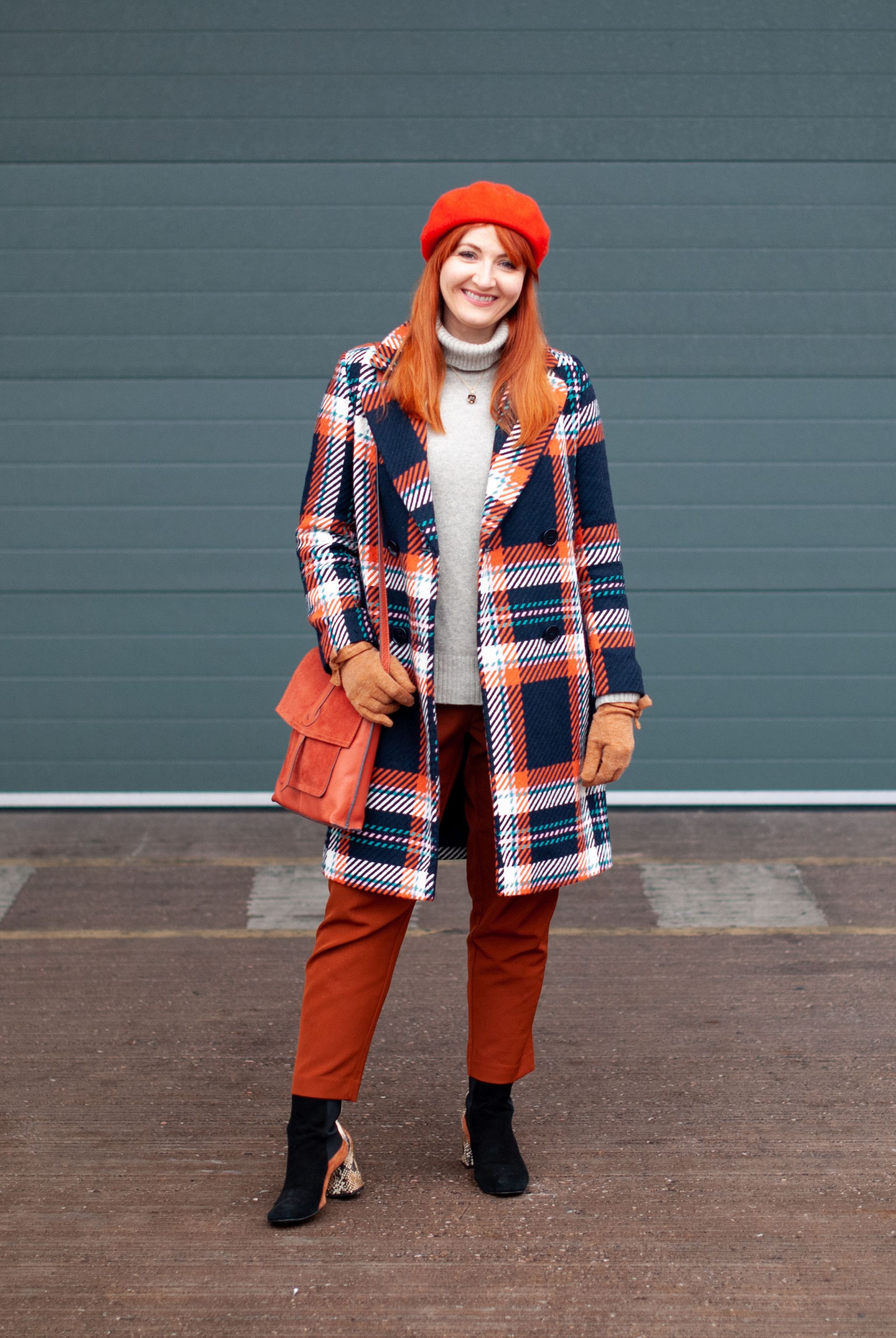 So let’s talk about the actual outfit itself: I’ve been wearing this check coat a lot since I got it last year – as you can probably imagine it goes with most of my wardrobe due to the, ahem, orange (and pink!) part of the check. The terracotta trousers are a newish purchase (I’ve been buying all the peg leg styles as they’re my favourite and so comfy to wear) and the bright orange beret was bought last year as part of Operation Buy All The Berets.
