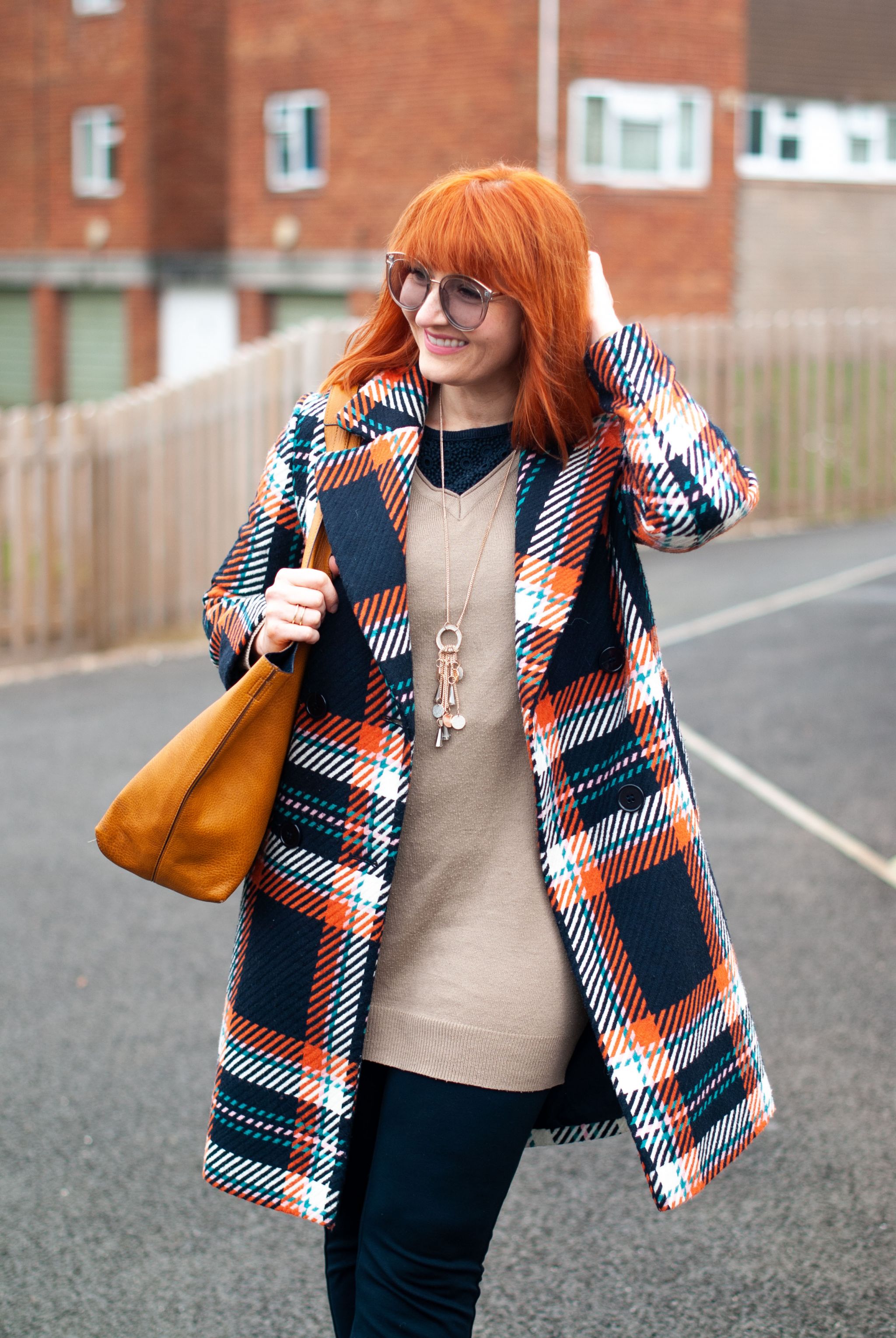 All the items I’m wearing are old/not brand new, and with the exception of the trousers (very comfy M&S bootcut leggings), no longer available unfortunately. But as always I’ve found some alternatives for you, including an almost-identical long tunic sweater (it may be maternity, but who cares?), a gorgeous tan leather tote with ring detail and a lightweight brown check coat that’s perfect for transitional spring dressing.