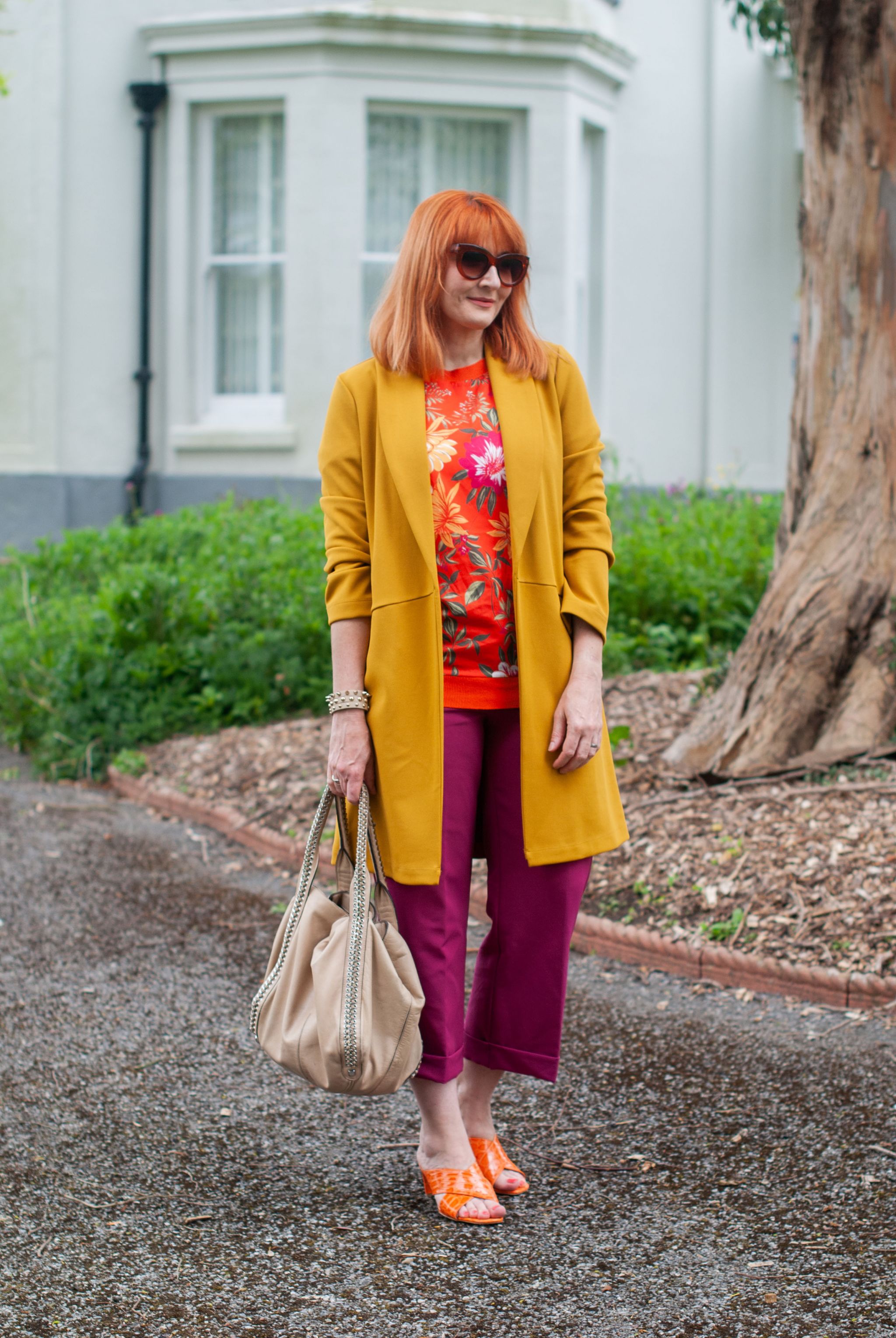 This concoction of bold spring/summer colours is right in my sartorial comfort zone: paired with my favourite oranges and yellow, the magenta is a strong anchor colour. It picks out the deep pink in the floral pattern of the fabulous floral top* and contrasts beautifully with the tangerine orange heels*.