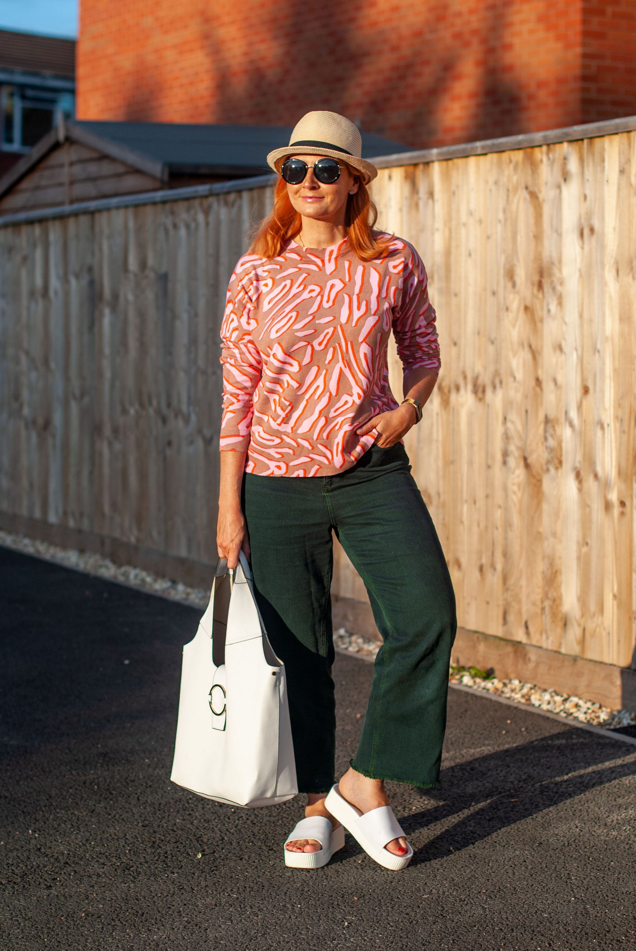 A lack of summer dress in this outfit meant I had to throw in some other summery stuff, so white sandals (worn loads this year) and white bag brightens the whole thing up and stops it going into autumn/winter territory – the thought of a black bag and/or black shoes with this just depresses me. Add a (very old) straw hat and big round sunglasses (I’ll allow myself the black in the odd accessory here and there) and it’s a simple summer sweater and jeans combo with a little pizazz thrown in.