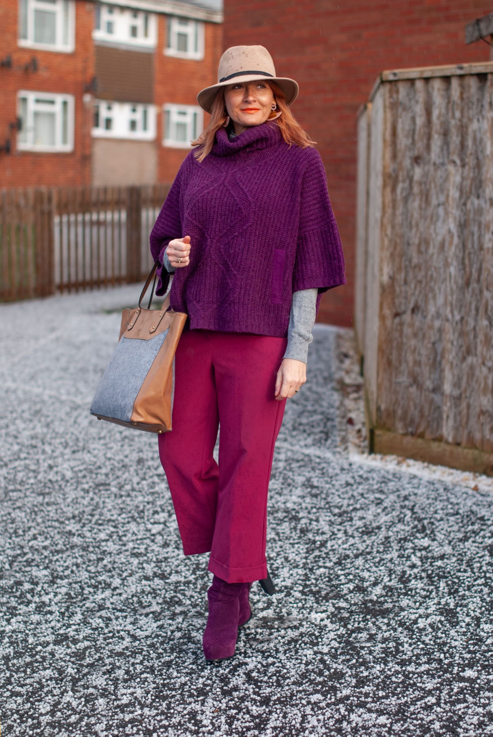 The purple knit was made for my (also old) knee-high platform boots which I knew would work under the loose fit of the magenta cropped trousers* (that I first wore back in May with a riot of bold summer colours). I’ve featured the boots in my ‘Ways to Wear’ section at the end of the post… my aim is to try and add this feature to every single outfit post if I can. It means I’m definitely rewearing all of my wardrobe and shows you how bold pieces and colourful accessories are just as versatile (if not more so) than black.