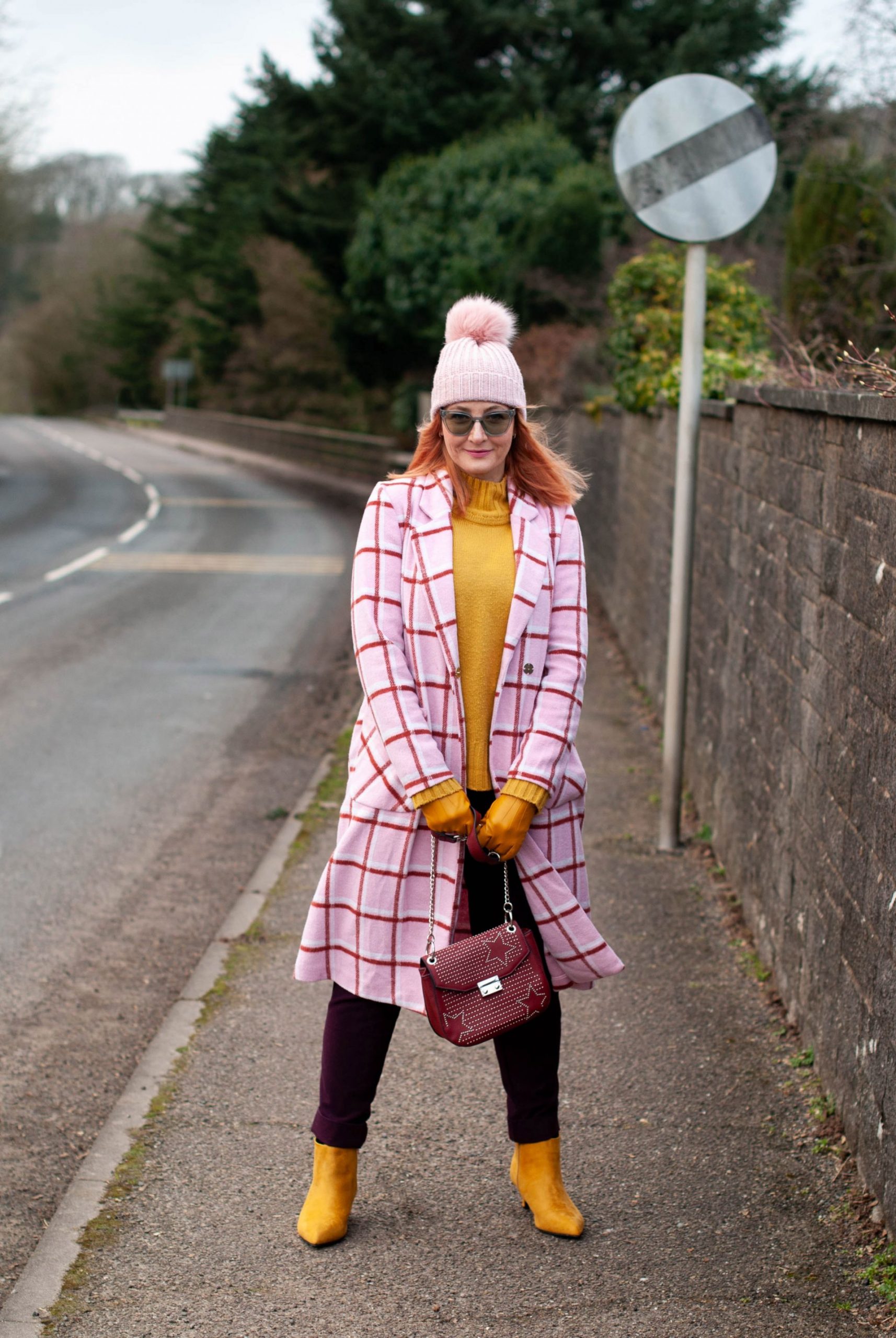 At the weekend I fancied wearing the pink check coat I first featured last winter, and yellow just jumped out at me from my wardrobe and begged to be worn with it. Who doesn’t feel happier looking at pink and yellow together? I toned the whole look down [I do see the irony in that…] by adding burgundy/plum peg leg trousers (similar) that have been worn to DEATH over the last several years. They’re a staple I wouldn’t be without in my wardrobe – you can see lots more ways they’ve been worn in today’s 5 Ways to Wear below.