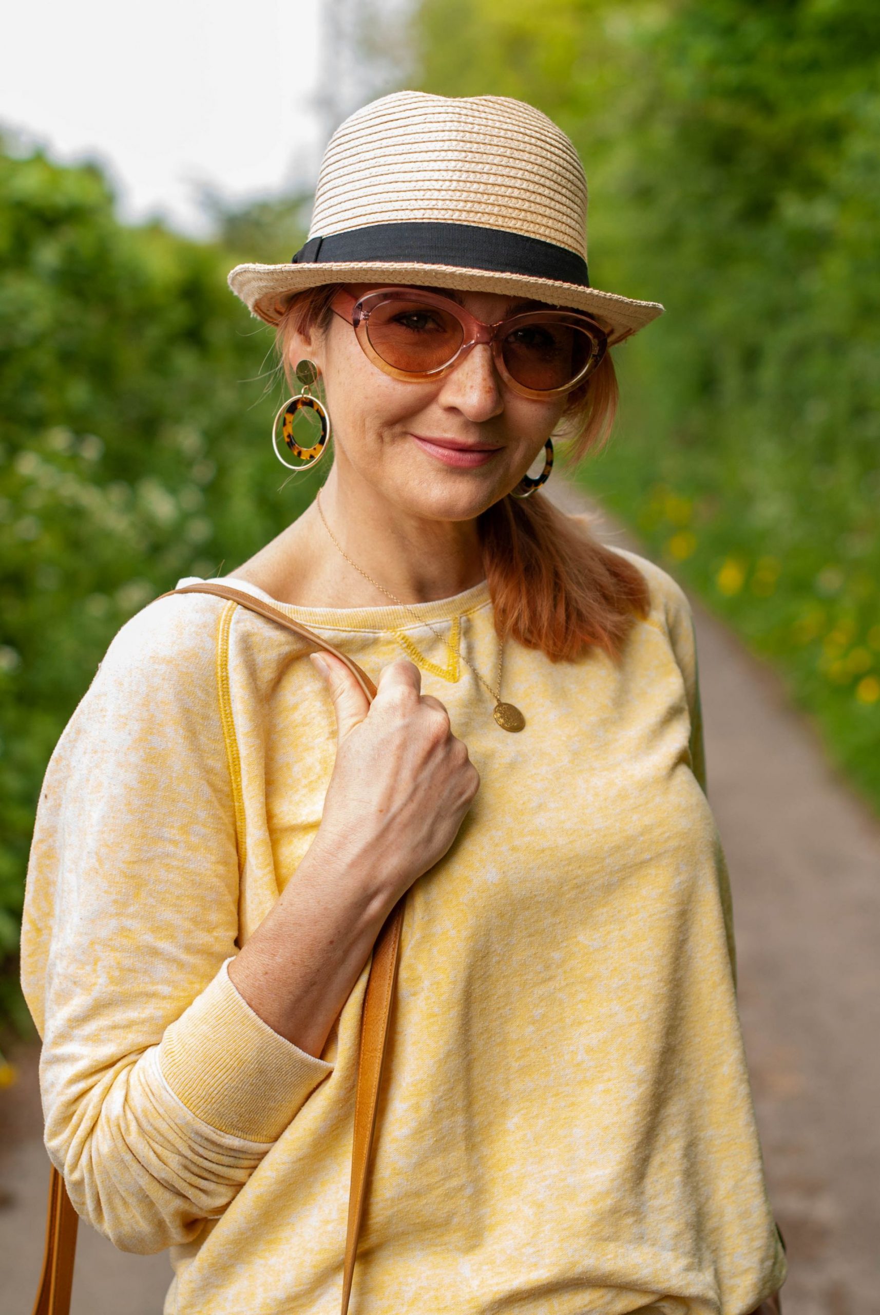 A simple, loose sweatshirt (very old, very much loved and somewhat less predictable than the classic grey sweatshirt) in a spring-suitable lemon yellow, my current fave rose gold trainers* and some check trousers – that I really should be wearing more – was what I ended up with. The trousers are high in the comfort stakes BUT the light beige-blue colours in the check mean they don’t look out of place in warmer weather.